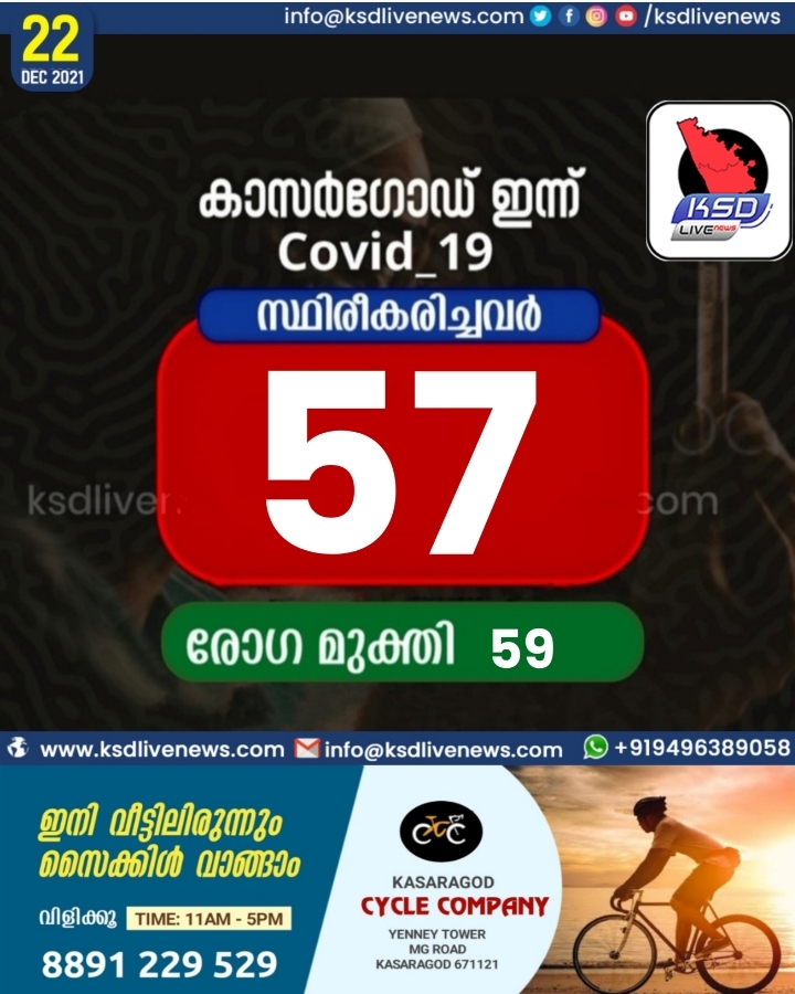 കാസർഗോഡ് ജില്ലയിൽ ഇന്ന് 57 പേർക്ക് കോവിഡ് സ്ഥിരീകരിച്ചു. 59 പേർക്ക് രോഗമുക്തി