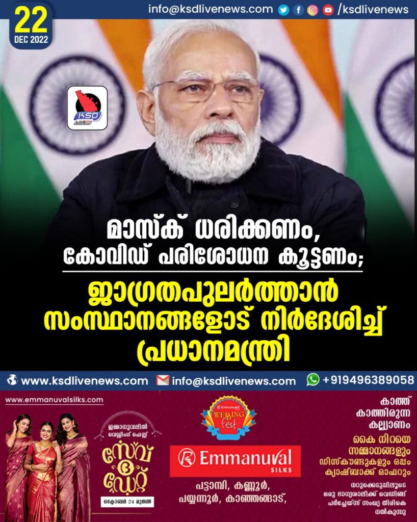 ന്യൂഡൽഹി: ചൈനയില്‍ പടരുന്ന കോവിഡ് ഉപവകഭേദമായ ബി.എഫ്. – 7 ഇന്ത്യയിലും സ്ഥിരീകരിച്ചതിന് പിന്നാലെ രാജ്യത്ത് ജാഗ്രത പുലർത്തണമെന്ന് പ്രധാനമന്ത്രി നരേന്ദ്ര മോദി. എല്ലാവരും മാസ്ക് ധരിക്കണമെന്നും രാജ്യത്ത് കോവിഡ് ടെസ്റ്റ് വർധിപ്പിക്കണമെന്നും കോവിഡ് അവലോകന യോഗത്തിന് ശേഷം പ്രധാനമന്ത്രി പറഞ്ഞു.