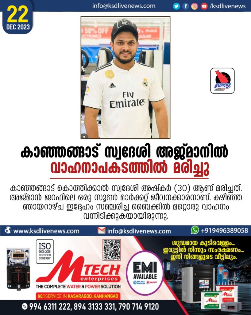 കാഞ്ഞങ്ങാട് സ്വദേശി അജ്മാനിൽ വാഹനാപകടത്തിൽ മരിച്ചു