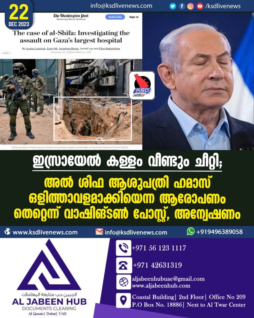 ഗസ്സയിലെ അൽ ശിഫ ആശുപത്രി പ്രവർത്തിച്ചിരുന്നത് ഹമാസ് ഒളിത്താവളമായിട്ടായിരുന്നെന്നും അവരുടെ പ്രവർത്തനങ്ങൾക്ക് ഉപയോഗിച്ചിരുന്ന ടണലുകൾക്ക് മുകളിലാണ് ആതുരാലയം പ്രവർത്തിച്ചിരുന്നതെന്നുമുള്ള ഇസ്രായേൽ പ്രചരണം വീണ്ടും പൊളിഞ്ഞു. അൽ ശിഫ ആശുപത്രിയെ ഹമാസ് കമാൻഡ് ആൻഡ് കൺട്രോൾ സെന്ററായി ഉപയോഗിച്ചിരുന്നുവെന്ന് കാണിക്കാനുള്ള തെളിവുകൾ ഒന്നുമില്ലെന്ന് വാഷിങ്ടൺ പോസ്റ്റ് അന്വേഷണത്തിൽ തെളിഞ്ഞു.