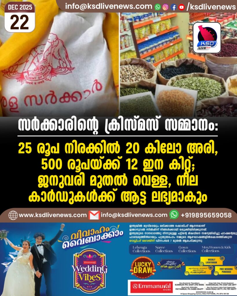 സർക്കാരിന്റെ ക്രിസ്മസ് സമ്മാനം: 25 രൂപ നിരക്കില് 20 കിലോ അരി, 500 രൂപയ്ക്ക് 12 ഇന കിറ്റ്; ജനുവരി മുതൽ വെള്ള, നീല കാർഡുകൾക്ക് ആട്ട ലഭ്യമാകും