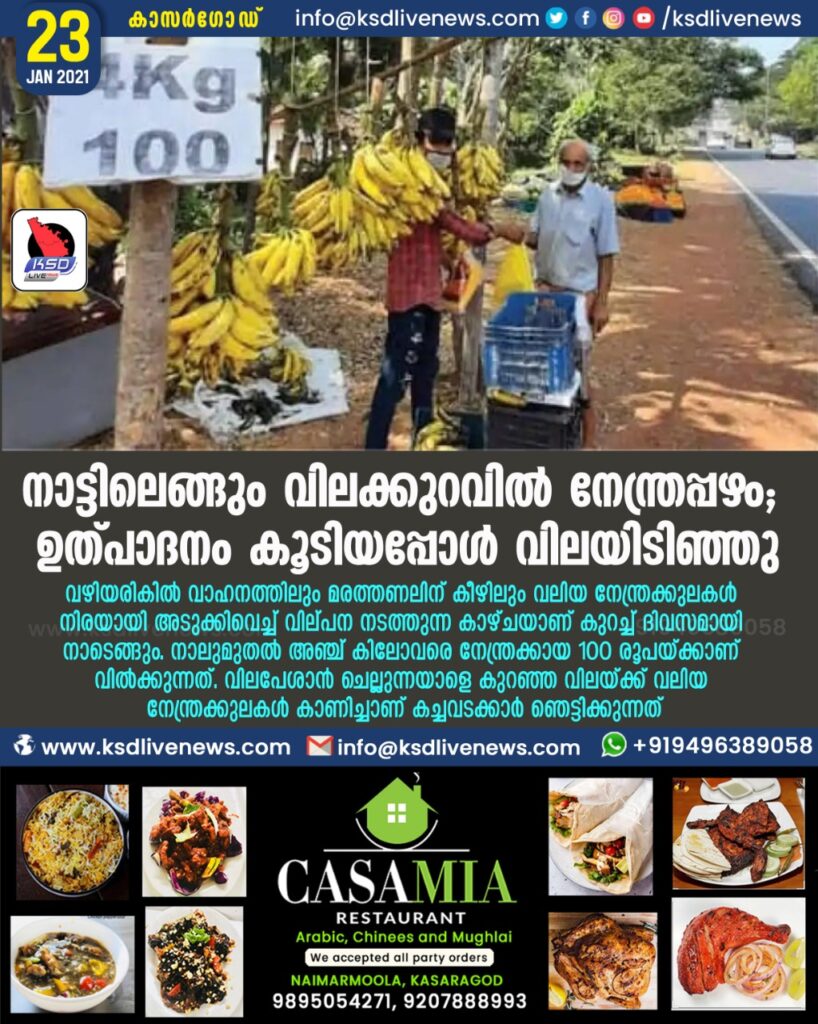 വഴിയരികിൽ വാഹനത്തിലും മരത്തണലിന് കീഴിലും വലിയ നേന്ത്രക്കുലകൾ നിരയായി അടുക്കിവെച്ച് വില്പന നടത്തുന്ന കാഴ്ചയാണ് കുറച്ച് ദിവസമായി നാടെങ്ങും. നാലുമുതൽ അഞ്ച് കിലോവരെ നേന്ത്രക്കായ 100 രൂപയ്ക്കാണ് വിൽക്കുന്നത്. വിലപേശാൻ ചെല്ലുന്നയാളെ കുറഞ്ഞ വിലയ്ക്ക് വലിയ നേന്ത്രക്കുലകൾ കാണിച്ചാണ് കച്ചവടക്കാർ ഞെട്ടിക്കുന്നത്.