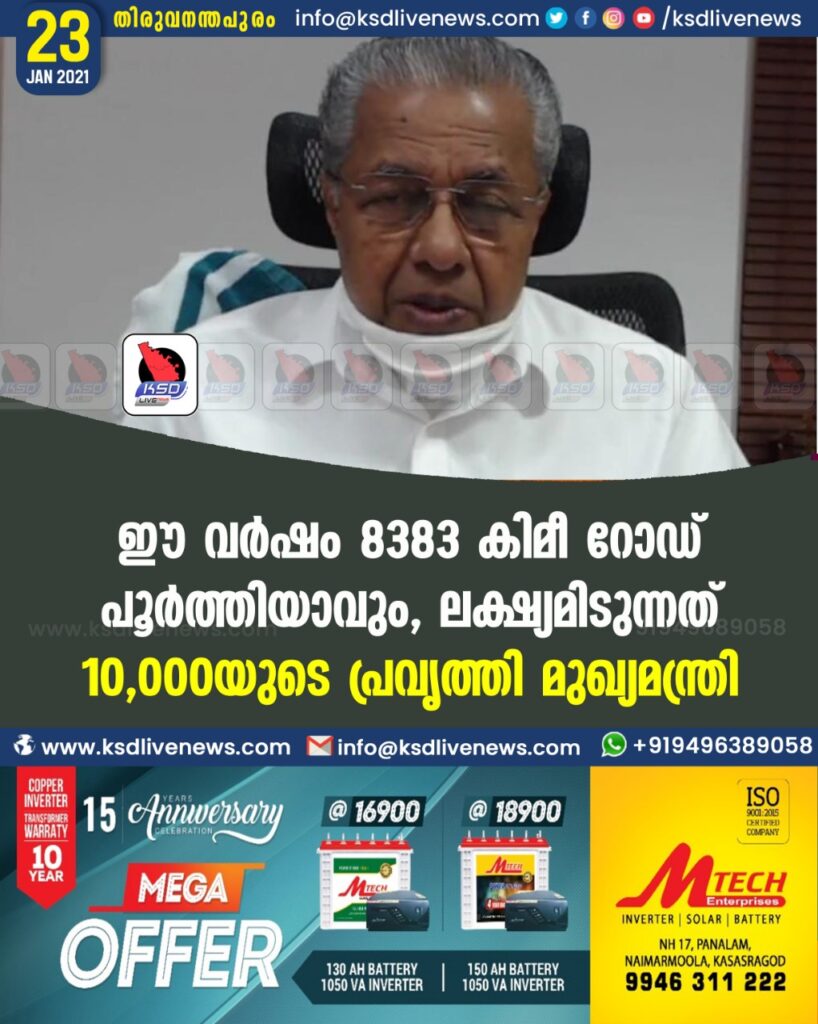 ഈ വര്‍ഷം 8383 കിമീ റോഡ് പൂര്‍ത്തിയാവും, ലക്ഷ്യമിടുന്നത് 10,000യുടെ പ്രവൃത്തി-മുഖ്യമന്ത്രി
