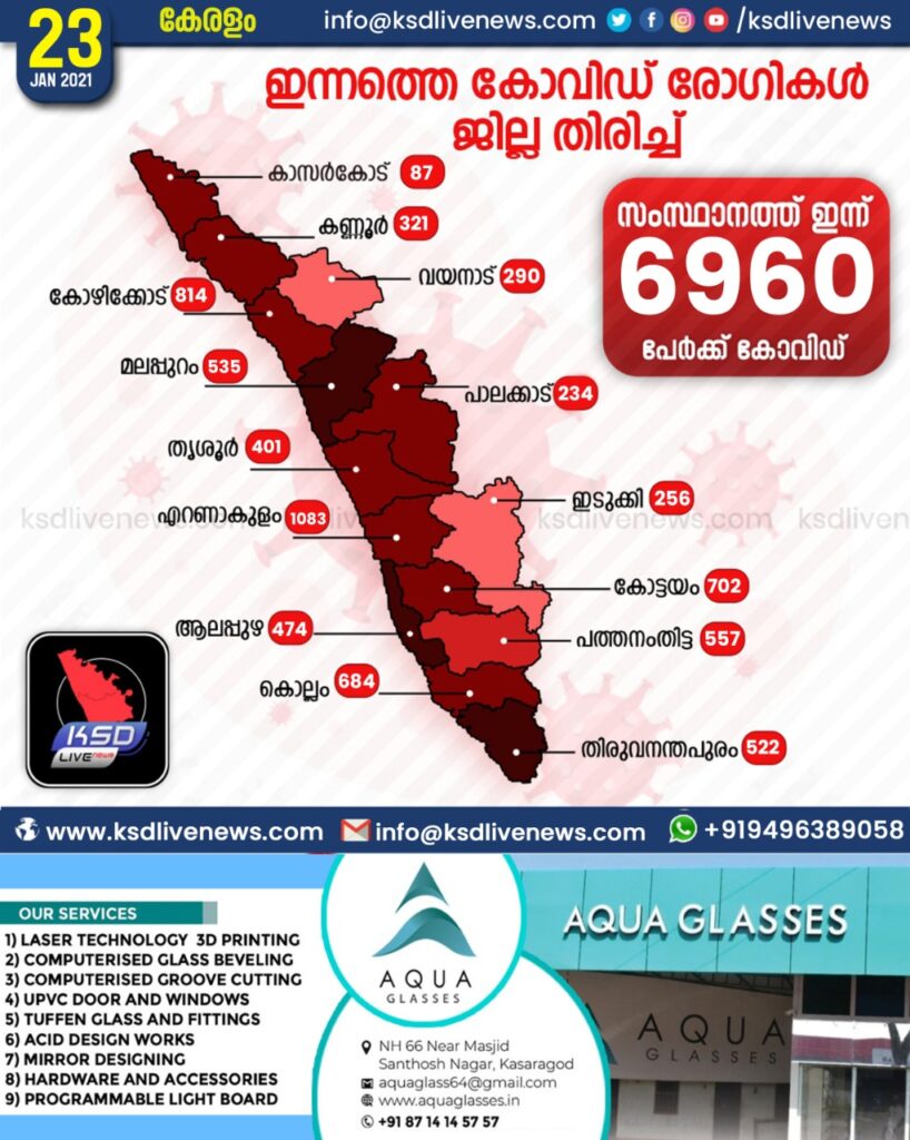 ഇന്ന് 6960 പേര്‍ക്ക് കോവിഡ്-19 സ്ഥിരീകരിച്ചു. എറണാകുളം 1083, കോഴിക്കോട് 814, കോട്ടയം 702, കൊല്ലം 684, പത്തനംതിട്ട 557, മലപ്പുറം 535, തിരുവനന്തപുരം 522, ആലപ്പുഴ 474, തൃശൂര്‍ 401, കണ്ണൂര്‍ 321, വയനാട് 290, ഇടുക്കി 256, പാലക്കാട് 234, കാസര്‍ഗോഡ് 87 എന്നിങ്ങനേയാണ് ജില്ലകളില്‍ ഇന്ന് രോഗ ബാധ സ്ഥിരീകരിച്ചത്.