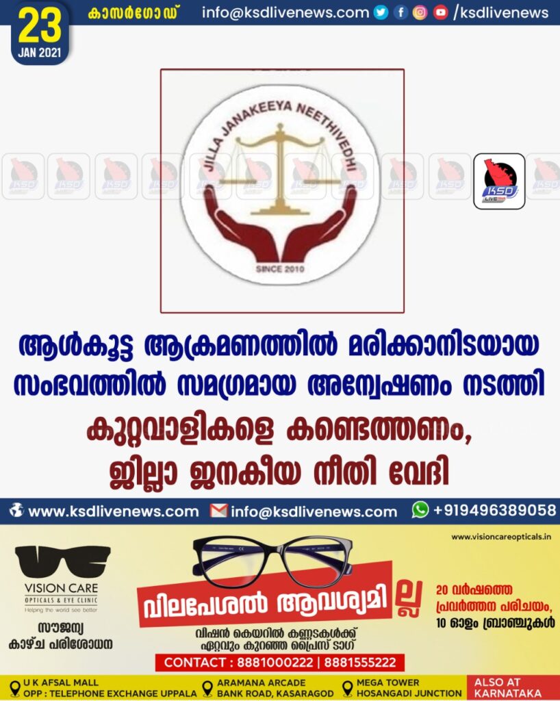 കാസർകോട്: ജനുവരി 23 ന് സായാഹ്നത്തിൽ കാസർകോട് ഒരു സ്വകാര്യ ആശുപത്രി പരിസരത്ത് വെച്ച് ആൾകൂട്ട ആക്രമണത്തിന് വിധേയനായി ചെമ്മനാട് സ്വദേശി റഫീക്ക് മരിക്കാനിടയായ സംഭവത്തിൽ സമഗ്രമമായ അന്വേഷണം നടത്തി കുറ്റവാളികളെ കണ്ടെത്തണമെന്ന് ജില്ലാ ജനകീയ നീതി വേദി ജില്ലാ കമ്മിറ്റി ആവശ്യപ്പെട്ടു.