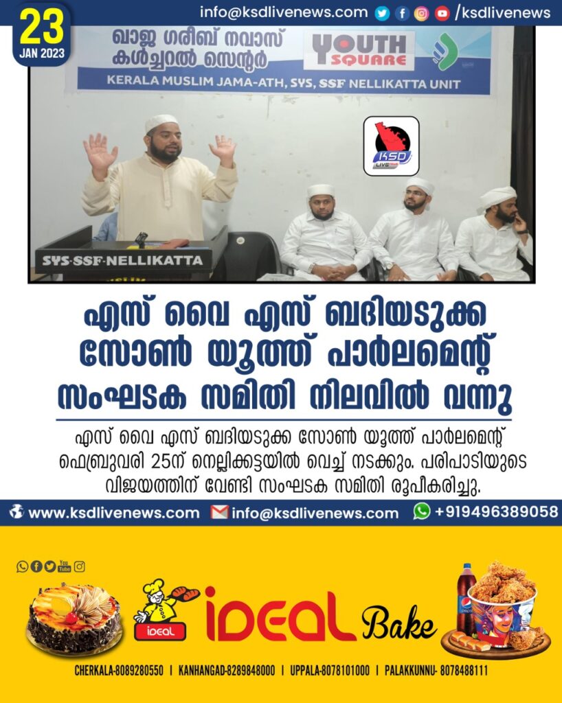 നെല്ലിക്കട്ട: എസ് വൈ എസ് ബദിയടുക്ക സോൺ യൂത്ത് പാർലമെന്റ് ഫെബ്രുവരി 25ന് നെല്ലിക്കട്ടയിൽ വെച്ച് നടക്കും. പരിപാടിയുടെ വിജയത്തിന് വേണ്ടി സംഘടക സമിതി രൂപീകരിച്ചു. (രക്ഷാധികരികൾ) സയ്യിദ് ഹുസൈൻ തങ്ങൾ,കബീർ ഹിമമി, ഉമ്മർ മീത്തൽ നെല്ലിക്കട്ട,ഷംസുദ്ദീൻ പൈക്ക