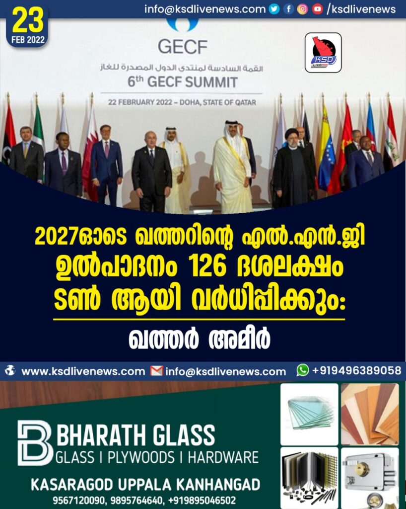 2027ഓടെ ഖത്തറിന്റെ ദ്രവീകൃത പ്രകൃതി വാതക ഉല്പാദനം 126 ദശലക്ഷം ടണ് ആയി വര്ധിപ്പിക്കുമെന്ന് അമീര് ശൈഖ് തമീം ബിന് ഹമദ് ആല്ഥാനി.