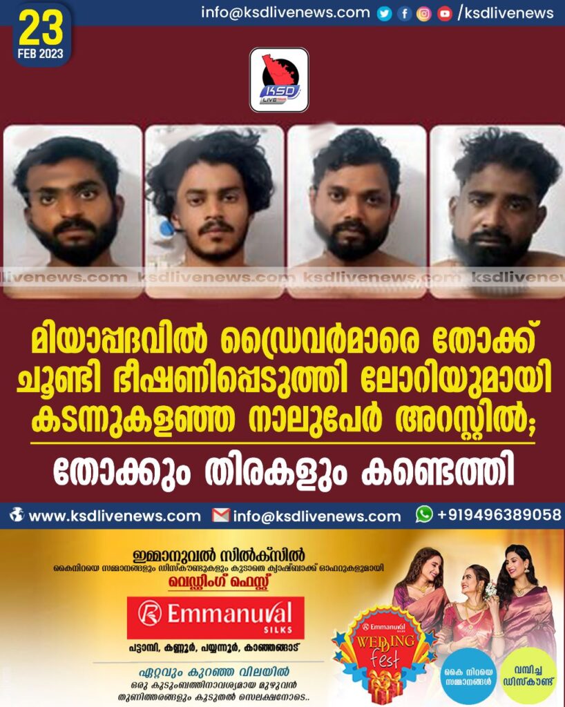 മിയാപ്പദവില്‍ ഡ്രൈവര്‍മാരെ തോക്ക് ചൂണ്ടി ഭീഷണിപ്പെടുത്തി ലോറിയുമായി കടന്നുകളഞ്ഞ നാലുപേര്‍ അറസ്റ്റില്‍; തോക്കും തിരകളും കണ്ടെത്തി
