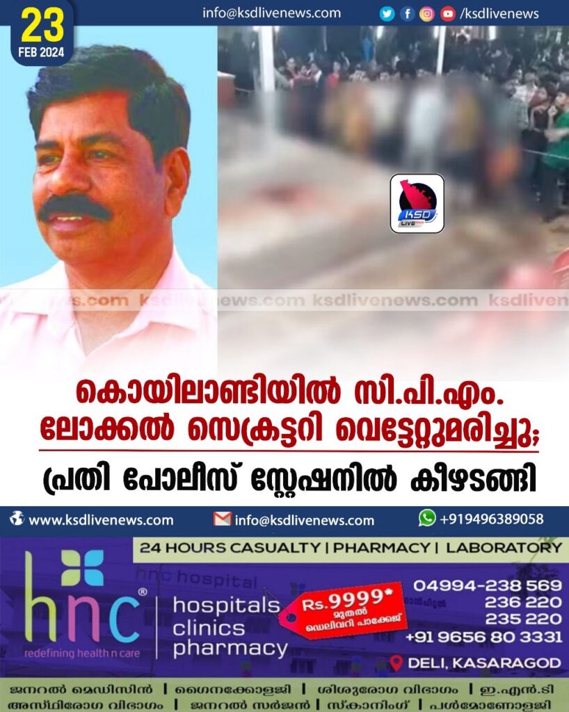 കൊയിലാണ്ടിയിൽ സി.പി.എം. ലോക്കൽ സെക്രട്ടറി വെട്ടേറ്റുമരിച്ചു; പ്രതി പോലീസ് സ്റ്റേഷനിൽ കീഴടങ്ങി