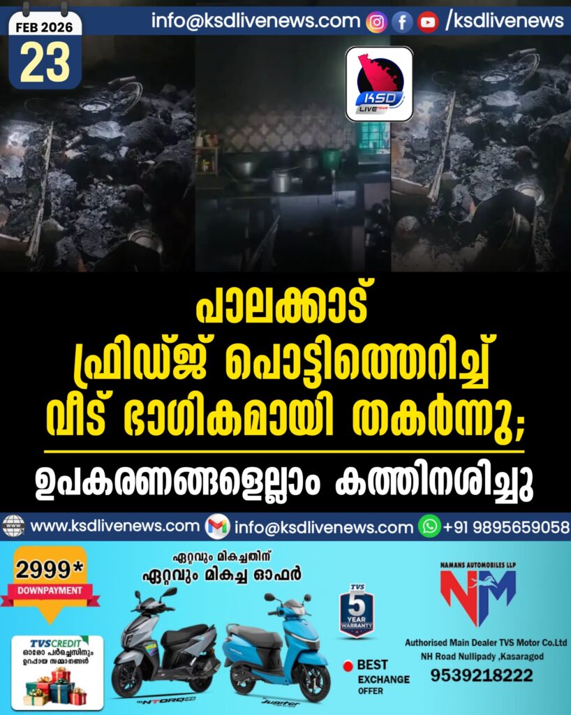 പാലക്കാട് ഫ്രിഡ്ജ് പൊട്ടിത്തെറിച്ച് വീട് ഭാഗികമായി തകര്ന്നു; ഉപകരണങ്ങളെല്ലാം കത്തിനശിച്ചു
