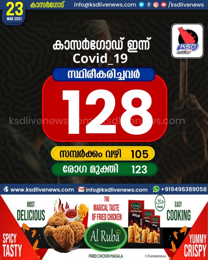 കാസർഗോഡ് ജില്ലയിൽ ഇന്ന് 128 പേർക്ക് കോവിഡ് സ്ഥിരീകരിച്ചു. സമ്പർക്കം വഴി 105 പേർക്കും. 123 പേർക്ക് രോഗമുക്തിSHARE THIS ON കാസർഗോഡ് • കാസർഗോഡ് ജില്ലയിൽ ഇന്ന് 128 പേർക്ക് കോവിഡ് സ്ഥിരീകരിച്ചു. സമ്പർക്കം വഴി 105 പേർക്കും. 123 പേർക്ക് രോഗമുക്തി