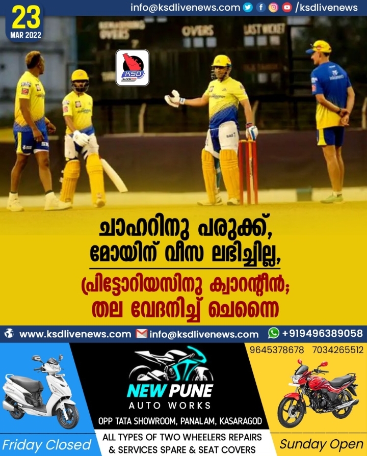 ദക്ഷിണാഫ്രിക്കൻ താരം പ്രിട്ടോറിയസ് മത്സരസമയത്തു ക്വാറന്റീനിലാകും. ദീപക് ചാഹർ പരുക്കിൽനിന്നു മോചിതനായിട്ടില്ല. ഇംഗ്ലണ്ട് ഓൾറൗണ്ടർ മോയിൻ അലിക്കാകട്ടെ, ഇന്ത്യയിലേക്കുള്ള വീസ ഇതുവരെ ലഭിച്ചിട്ടുമില്ല. കഴിഞ്ഞ സീസണൊടുവിൽ 8 കോടി രൂപ മുടക്കിയാണു ചെന്നൈ മോയിൻ അലിയെ നിലനിർത്തിയത്.