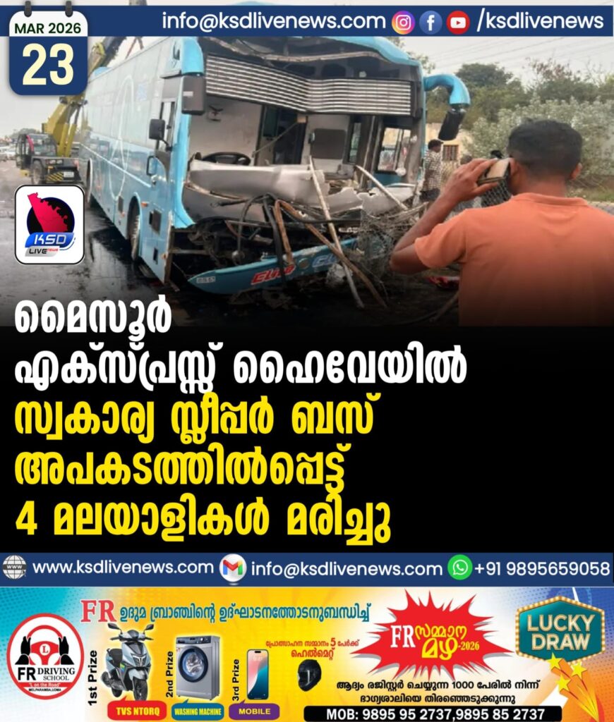 മൈസൂർ എക്സ്പ്രസ്സ് ഹൈവേയിൽ സ്വകാര്യ സ്ലീപ്പർ ബസ് അപകടത്തിൽപ്പെട്ട് 4 മലയാളികൾ മരിച്ചു