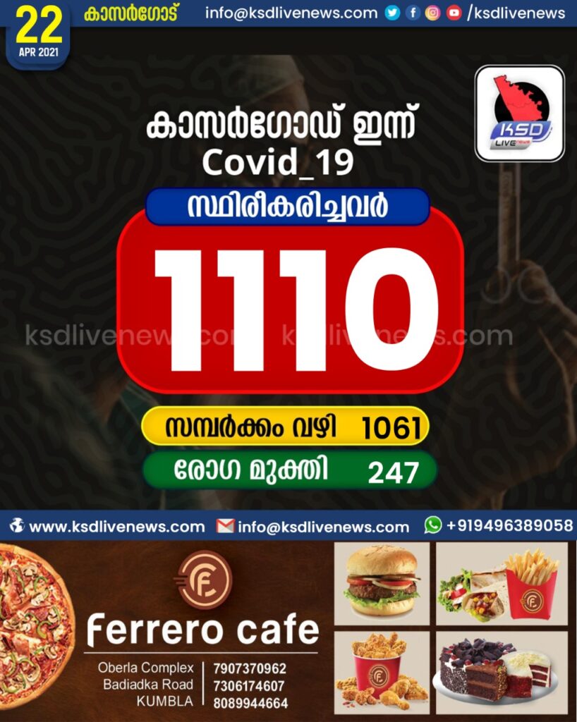 കാസർഗോഡ് ജില്ലയിൽ ഇന്ന് ഏറ്റവും ഉയർന്ന കോവിഡ് പ്രതിദിന കണക്ക്; 1110 പേർക്ക് കോവിഡ് സ്ഥിരീകരിച്ചു. സമ്പർക്കം വഴി 1061 പേർക്കും. 247 പേർക്ക് രോഗമുക്തിSHARE THIS ONകാസർഗോഡ് ജില്ലയിൽ ഇന്ന് ഏറ്റവും ഉയർന്ന കോവിഡ് പ്രതിദിന കണക്ക്; 1110 പേർക്ക് കോവിഡ് സ്ഥിരീകരിച്ചു. സമ്പർക്കം വഴി 1061 പേർക്കും. 247 പേർക്ക് രോഗമുക്തി