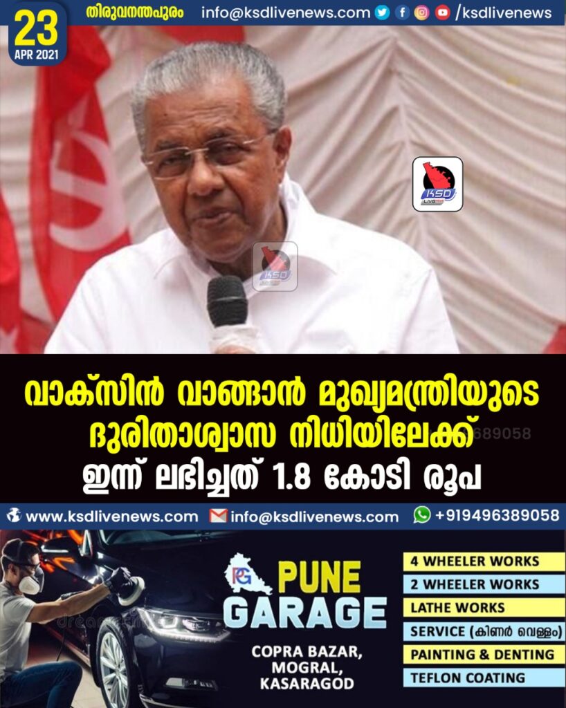 വാക്സിന് വാങ്ങാന് മുഖ്യമന്ത്രിയുടെ ദുരിതാശ്വാസ നിധിയിലേക്ക് ഇന്ന് ലഭിച്ചത് 1.8 കോടി രൂപ