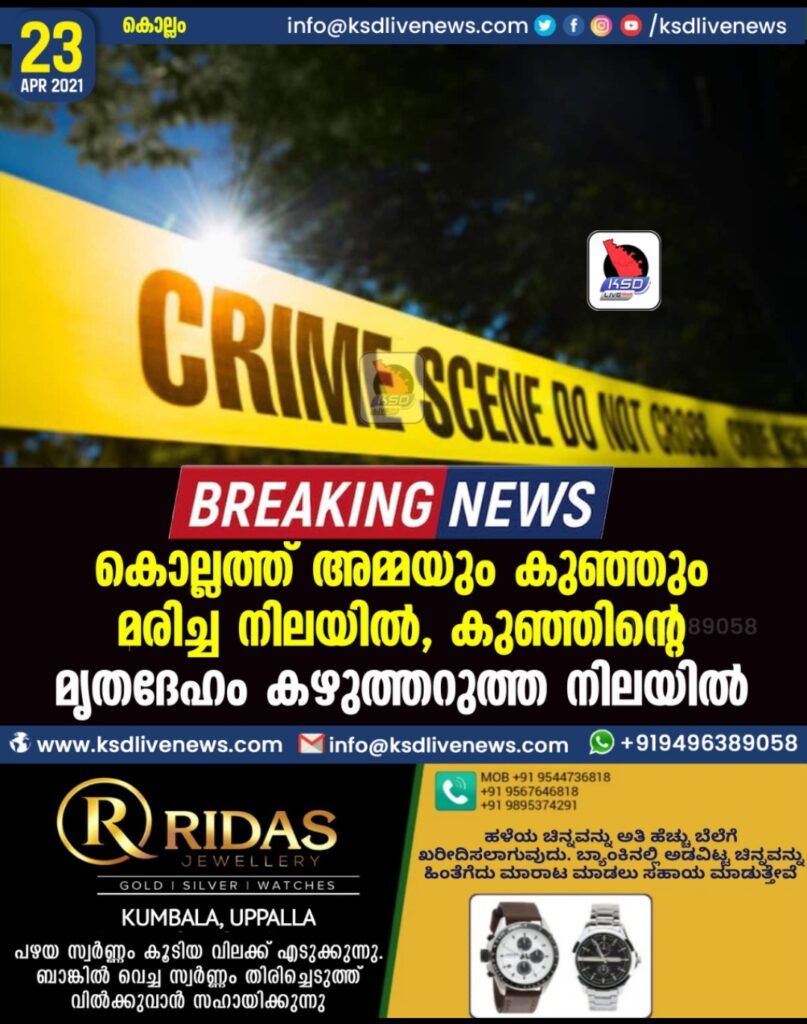 കൊല്ലം: കൊല്ലം ഇടക്കുളങ്ങരയിൽ രണ്ടര വയസുള്ള കുഞ്ഞിനെയും അമ്മയേയും മരിച്ച നിലയിൽ കണ്ടെത്തി.സൂര്യ (35) മകൻ ആദിദേവ് (രണ്ടര) എന്നിവരാണ് മരിച്ചത്. കുഞ്ഞിൻ്റെ മൃതദേഹം കഴുത്തറുത്ത നിലയിലാണായിരുന്നു. കുഞ്ഞിനെ കഴുത്തറുത്തു കൊന്ന ശേഷം അമ്മ ആത്മഹത്യ ചെയ്തതെന്ന് സൂചന.