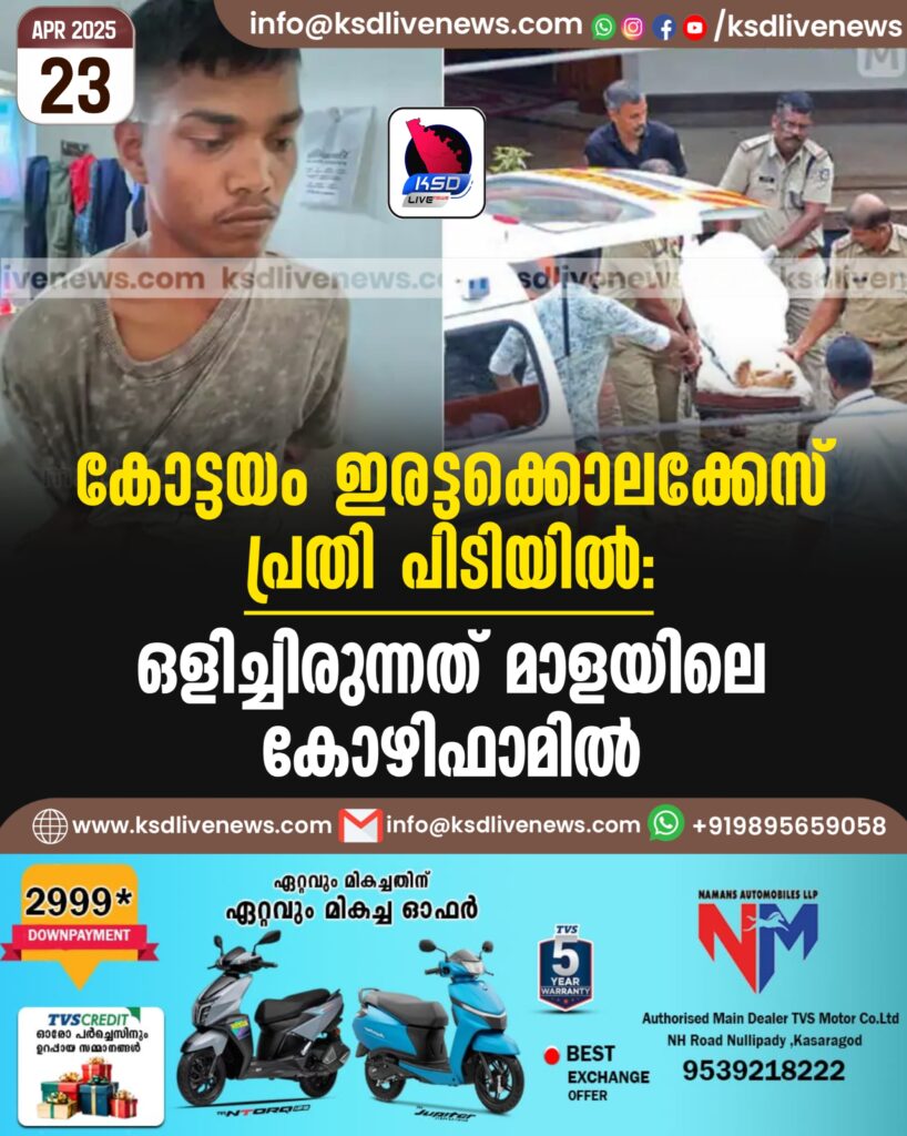 കോട്ടയം ഇരട്ടക്കൊലക്കേസ് പ്രതി പിടിയിൽ; ഒളിച്ചിരുന്നത് മാളയിലെ കോഴിഫാമിൽ