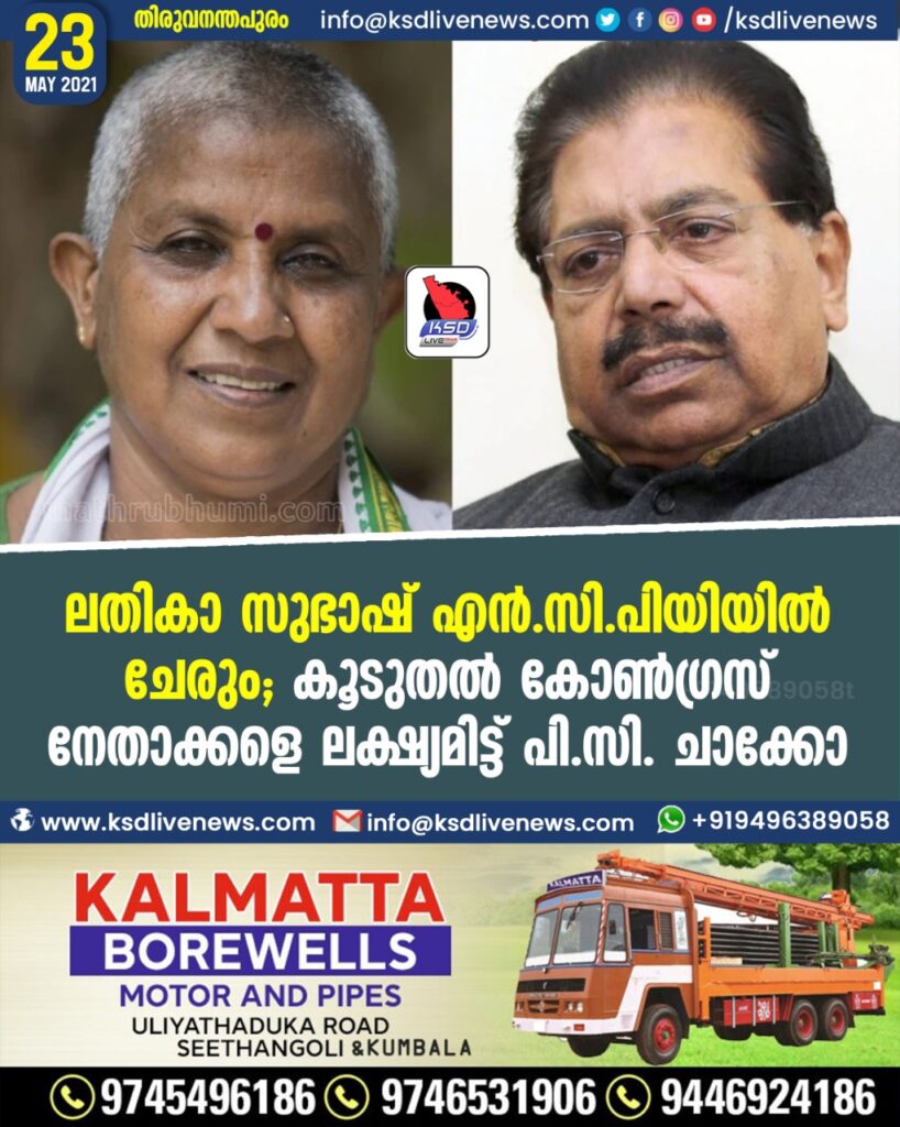 ഇതിനിടെ കോൺഗ്രസുമായി ഇടഞ്ഞ് നിൽക്കുന്ന നേതാക്കളെ പാർട്ടിയിലെത്തിക്കാനുള്ള ശ്രമങ്ങൾ നടത്തി വരികയാണ് എൻ.സി.പിയുടെ സംസ്ഥാന അധ്യക്ഷ പദവി ഏറ്റെടുത്ത പി.സി.ചാക്കോ. അതിന്റെ ആദ്യപടിയാണ് ലതികാ സുഭാഷിനെ പാർട്ടിയിലെത്തിക്കൽ. അടുത്തിടെയാണ് തന്നെ അവഗണിക്കുന്നുവെന്നാരോപിച്ച് പി.സി.ചാക്കോ കോൺഗ്രസ് വിട്ടത്.