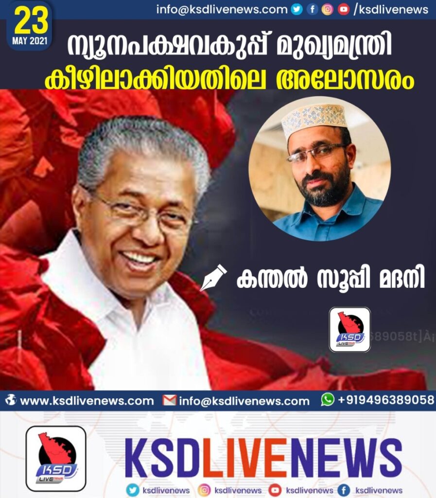 ഇപ്പോൾ ന്യൂനപക്ഷ വകുപ്പ് വീതം വെച്ചപ്പോൾ പതിവിന് വിപരീതമായി പ്രസ്തുത വകുപ്പ് മുഖ്യ മന്ത്രിയുടെ കീഴിലാക്കി എന്നത് അതി ഭയാനകരമായ എന്തോ അപരാധമാണെന്ന മട്ടിൽ കഴിഞ്ഞ യു ഡി എഫ് ഭരണത്തിലെ അഞ്ചാണ്ട് കാലം ആ വകുപ്പ് സ്വന്തം കക്ഷത്ത് മുറുക്കിപ്പിടിച്ച് സ്വ സമുദായത്തെപ്പോലും മറന്ന് തങ്ങളുടെ ഇഷ്ടക്കാരെ മാത്രം തൃപ്തിപ്പെടുത്തുന്നതിൽ പ്രത്യേകം താല്പര്യപ്പെട്ട് അതിനായി മുൻഗണന നൽകിയ ഒരു മത രാഷ്ട്രീയ പാർട്ടി എന്തൊക്കെയോ വിളിച്ചു കൂവുകയാണ്. ലക്ഷ്യം തങ്ങളുടെ എല്ലാ പ്രതീക്ഷകൾക്കും മേലെ ഉൽബുദ്ധ കേരളം ഒന്നായി മണ്ണുകൾ വാരിയിട്ട് അവ കൂനകളായി വളർന്നപ്പോൾ ഒന്ന് നേരാം വണ്ണം അതിനകത്ത് ഞരങ്ങാൻ പോലും ആവാത്ത അധോഗതിയിൽ നിന്നും ചെറുതായി ശ്വസിക്കാനുള്ള ചെറിയൊരു ദ്വാരമെങ്കിലും ലഭിച്ചെങ്കിലോ എന്നത് മാത്രമെന്ന് മനസ്സിലാക്കി അത്തരം കുപ്രചരണ ശ്രമങ്ങളെ അവരുടെ മേൽ മണ്ണ് വാരിയിട്ട അതേ ഉൽബുദ്ധ ജനത പുറംകാൽകൊണ്ട് തട്ടിത്തെറിപ്പിച്ചു കൊണ്ടിരിക്കുകയുമാണ്.