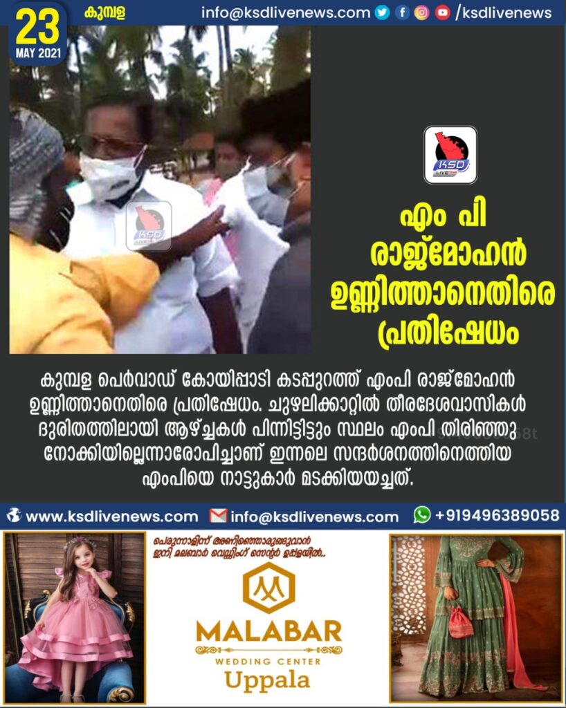 കാസര്കോഡ്: കുമ്പള പെര്വാഡ് കോയിപ്പാടി കടപ്പുറത്ത് എംപി രാജ്മോഹന് ഉണ്ണിത്താനെതിരെ പ്രതിഷേധം. ചുഴലിക്കാറ്റില് തീരദേശവാസികള് ദുരിതത്തിലായി ആഴ്ച്ചകള് പിന്നിട്ടിട്ടും സ്ഥലം എംപി തിരിഞ്ഞു നോക്കിയില്ലെന്നാരോപിച്ചാണ് ഇന്ന് സന്ദര്ശനത്തിനെത്തിയ എംപിയെ നാട്ടുകാര് മടക്കിയയച്ചത്. ടൗട്ടേ ചുഴലിക്കാറ്റിനെ തുടര്ന്നുണ്ടായ കടല്ക്ഷോഭത്തില് ഏറെ നാശനഷ്ടങ്ങളുണ്ടായ പ്രദേശമാണിത്.