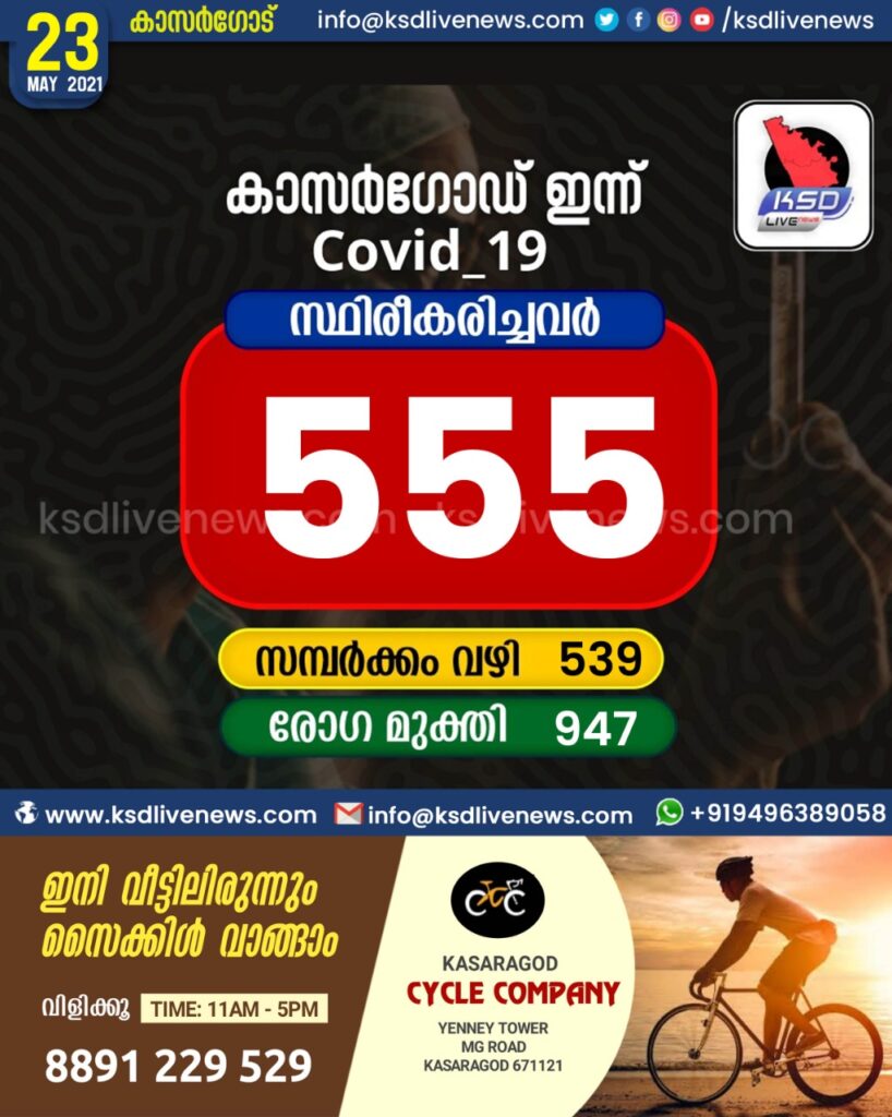 കാസർഗോഡ് ജില്ലയിൽ ഇന്ന് 555 പേർക്ക് കോവിഡ് സ്ഥിരീകരിച്ചു. സമ്പർക്കം വഴി 539 പേർക്കും. 947 പേർക്ക് രോഗമുക്തി