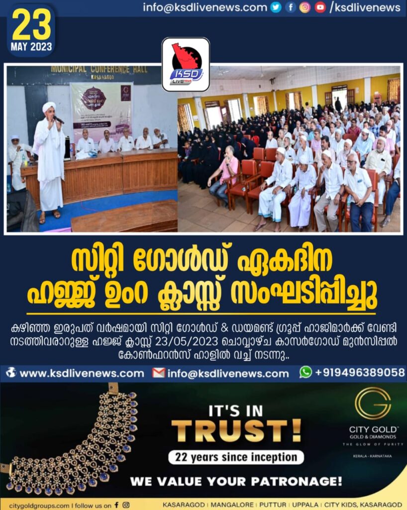 കാസർഗോഡ് : കഴിഞ്ഞ ഇരുപത് വർഷമായി സിറ്റി ഗോൾഡ് & ഡയമണ്ട് ഗ്രൂപ്പ് ഹാജിമാർക്ക് വേണ്ടി നടത്തിവരാറുള്ള ഹജ്ജ് ക്ലാസ്സ് 23/05/2023 ചൊവ്വാഴ്ച കാസർഗോഡ് മുൻസിപ്പൽ കോൺഫറൻസ് ഹാളിൽ വച്ച് നടന്നു..