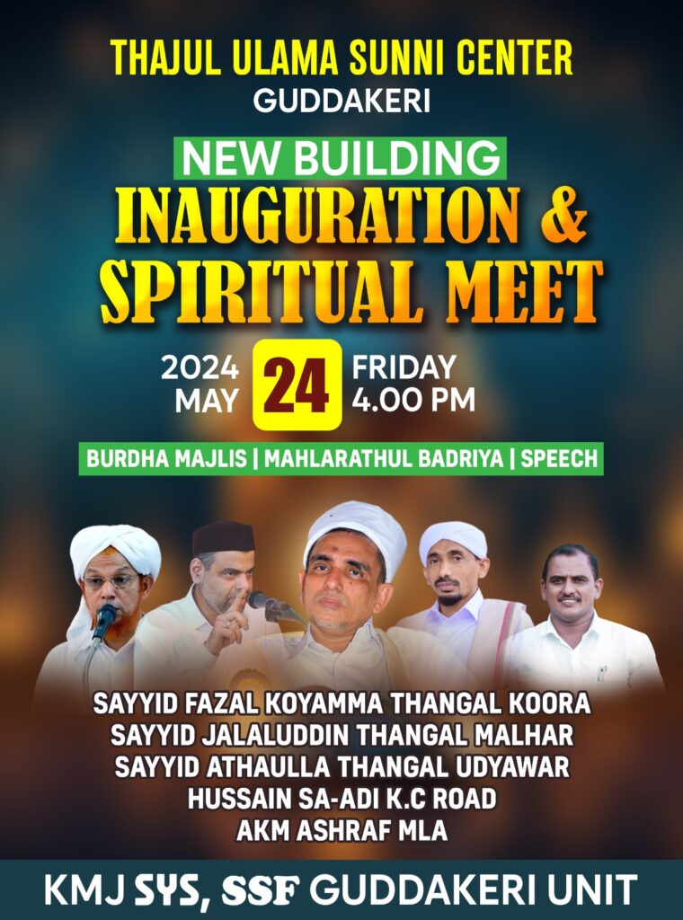 ഗുഡ്ഢകേരി താജുൽ ഉലമ സുന്നി സെന്റർ പുതിയ കെട്ടിട്ടം ഉദ്ഘാടനം നാളെ വൈകിട്ട് 4 മണിക്ക് സയ്യിദ് ഫസൽ കോയമ്മ തങ്ങൾ കുറ നിർവഹിക്കും