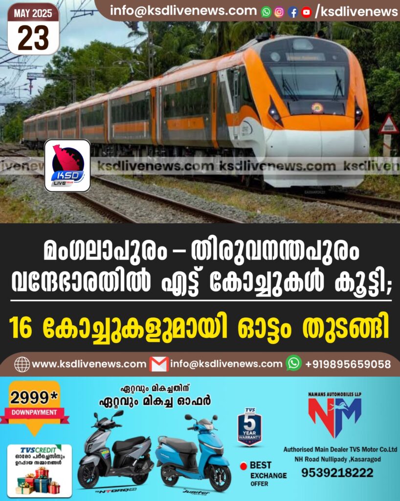 മംഗലാപുരം-തിരുവനന്തപുരം വന്ദേഭാരതില് എട്ട് കോച്ചുകള് കൂട്ടി; 16 കോച്ചുകളുമായി ഓട്ടം തുടങ്ങി