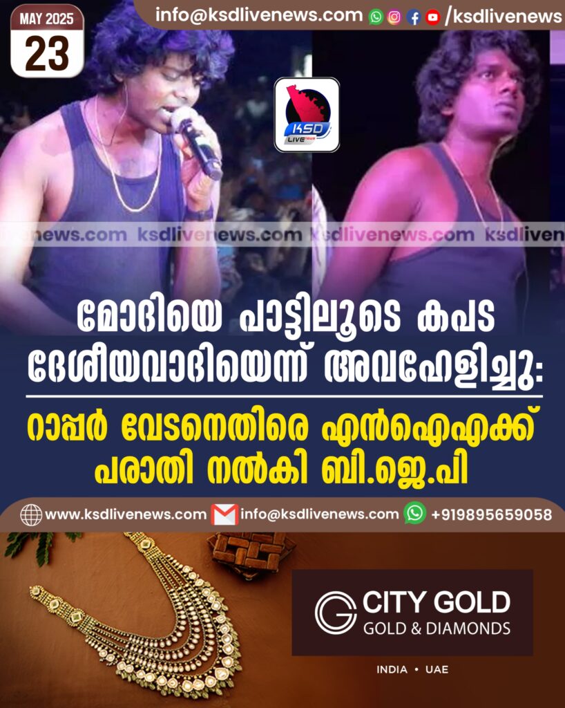 മോദിയെ പാട്ടിലൂടെ കപട ദേശീയവാദിയെന്ന് അവഹേളിച്ചു: റാപ്പർ വേടനെതിരെ എൻഐഎക്ക് പരാതി നൽകി ബിജെപി
