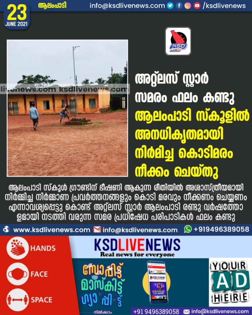 ആലംപാടി: ആലംപാടി സ്കൂൾ ഗ്രൗണ്ടിന് ഭീഷണി ആകുന്ന രീതിയിൽ അശാസ്ത്രീയമായി നിര്മ്മിച്ച നിർമ്മാണ പ്രവർത്തനങ്ങളും കൊടി മരവും നീക്കണം ചെയ്യണം എന്നാവശ്യപ്പെട്ടു കൊണ്ട് അറ്റ്ലസ് സ്റ്റാർ ആലംപാടി രണ്ടു വർഷത്തോളമായി നടത്തി വരുന്ന സമര പ്രധിഷേധ പരിപാടികൾ ഫലം കൊണ്ട്. അധികൃതരുടെ നിർദ്ദേശത്തെ തുടർന്ന് കോടി മരം നീക്കം ചെയ്തു. അശാത്രീയ നിർമ്മാണ പ്രവർത്തനങ്ങൾ നേരത്തെ തന്നെ നിർത്തി വെച്ചിരുന്നു.