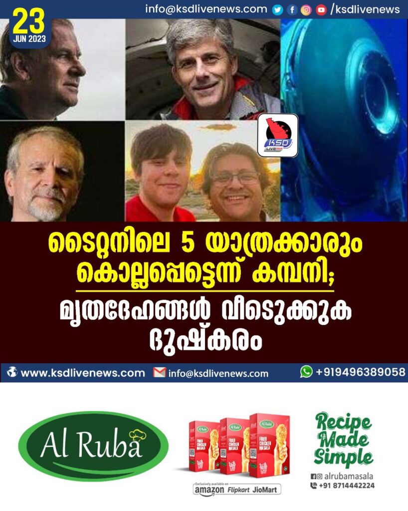 ടൈറ്റനിലെ 5 യാത്രക്കാരും കൊല്ലപ്പെട്ടെന്ന് കമ്പനി; മൃതദേഹങ്ങൾ വീണ്ടെടുക്കുക ദുഷ്‌കരം