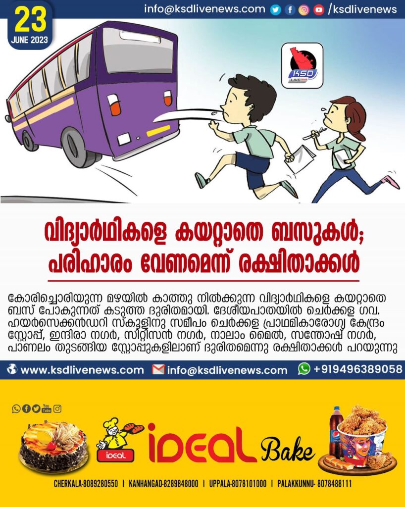 കാസർകോട്: കോരിച്ചൊരിയുന്ന മഴയിൽ കാത്തു നിൽക്കുന്ന വിദ്യാർഥികളെ കയറ്റാതെ ബസ് പോകുന്നത് കടുത്ത ദുരിതമായി. ദേശീയപാതയിൽ ചെർക്കള ഗവ.ഹയർസെക്കൻഡറി സ്കൂളിനു സമീപം ചെർക്കള പ്രാഥമികാരോഗ്യ കേന്ദ്രം സ്റ്റോപ്പ്, ഇന്ദിരാ നഗർ, സിറ്റിസൻ നഗർ, നാലാം മൈൽ, സന്തോഷ് നഗർ, പാണലം തുടങ്ങിയ സ്റ്റോപ്പുകളിലാണ് ദുരിതമെന്നു രക്ഷിതാക്കൾ പറയുന്നു. മഴ കുറവാണെങ്കിലും കനത്ത മഴ പെയ്യും നേരത്ത് കയറി നിൽക്കാൻ ഒരു കടത്തിണ്ണ പോലും കിട്ടാത്ത സ്റ്റോപ്പുകളിൽ പുസ്തകവും വസ്ത്രവും നനഞ്ഞു കുതിർന്നു നിൽക്കേണ്ട അവസ്ഥയിലാണ് വിദ്യാർഥികൾ.