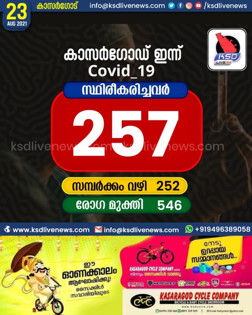 കാസർഗോഡ് ജില്ലയിൽ ഇന്ന് 257 പേർക്ക് കോവിഡ് സ്ഥിരീകരിച്ചു. സമ്പർക്കം വഴി 252 പേർക്കും. 546 പേർക്ക് രോഗമുക്തിSHARE THIS ON