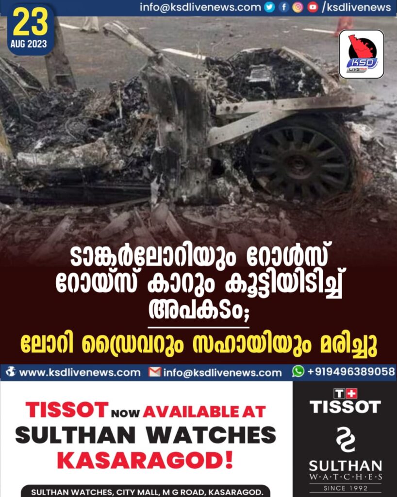 ടാങ്കര്ലോറിയും റോള്സ് റോയ്സ് കാറും കൂട്ടിയിടിച്ച് അപകടം; ലോറി ഡ്രൈവറും സഹായിയും മരിച്ചു