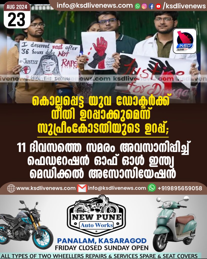 കൊല്ലപ്പെട്ട യുവ ഡോക്ടര്ക്ക് നീതി ഉറപ്പാക്കുമെന്ന് സുപ്രീംകോടതിയുടെ ഉറപ്പ്: 11 ദിവസത്തെ സമരം അവസാനിപ്പിച്ച് ഫെഡറേഷന് ഓഫ് ഓള് ഇന്ത്യ മെഡിക്കല് അസോസിയേഷന്