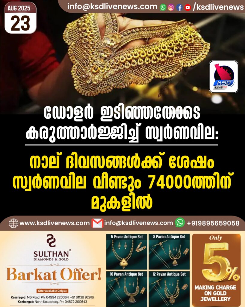 ഡോളര് ഇടിഞ്ഞതോടെ കരുത്താര്ജ്ജിച്ച് സ്വര്ണവില; നാല് ദിവസങ്ങള്ക്ക് ശേഷം സ്വര്ണവില വീണ്ടും 74000 ത്തിന് മുകളില്