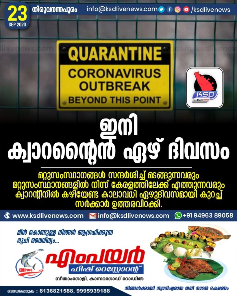 മറ്റുസംസ്ഥാനങ്ങള്‍ സന്ദര്‍ശിച്ച്‌ മടങ്ങുന്നവരും മറ്റുസംസ്ഥാനങ്ങളില്‍നിന്ന് കേരളത്തിലേക്ക് എത്തുന്നവരും ക്വാറന്റീനില്‍ കഴിയേണ്ട കാലാവധി ഏഴുദിവസമായി കുറച്ച്‌ സര്‍ക്കാര്‍ ഉത്തരവിറക്കി.