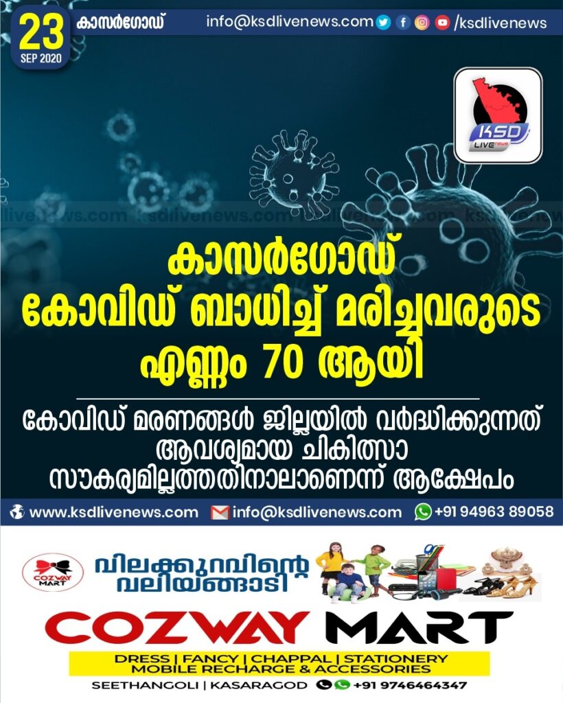 കാസർഗോഡ് കോവിഡ് ബാധിച്ച് മരിച്ചവരുടെ എണ്ണം 70 ആയി ;