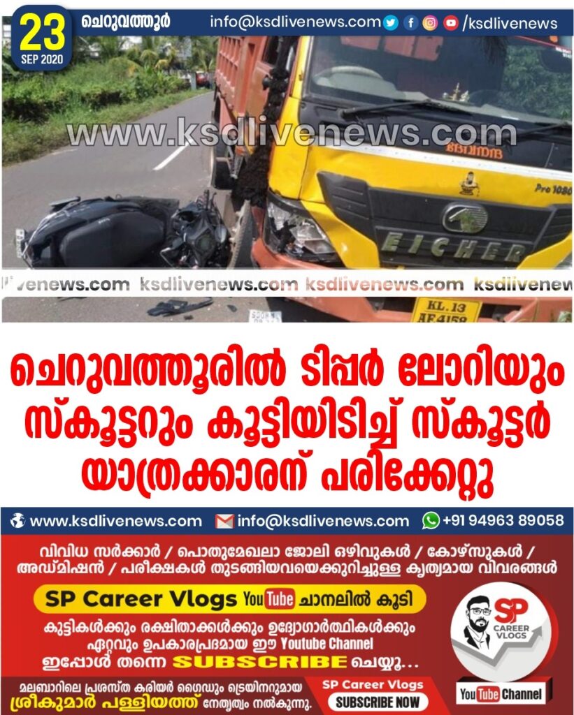 ചെറുവത്തൂരില്‍ ടിപ്പര്‍ ലോറിയും സ്‌കൂട്ടറും കൂട്ടിയിടിച്ച് സ്‌കൂട്ടര്‍ യാത്രക്കാരന് പരിക്കേറ്റു