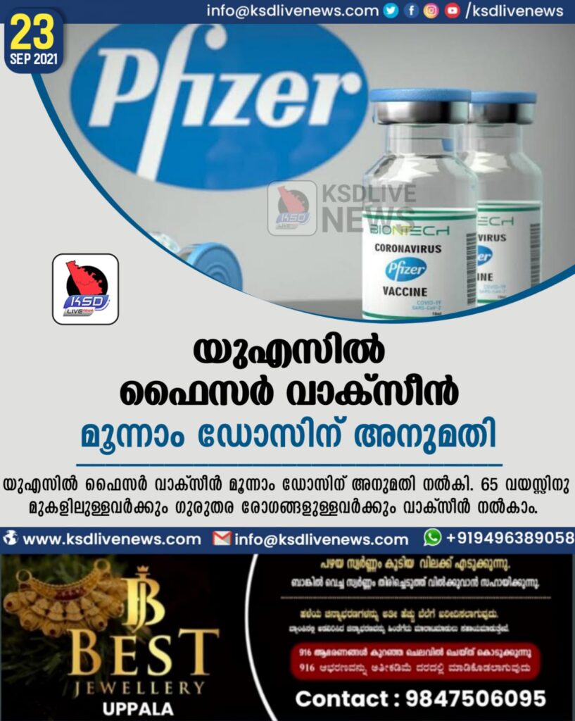 യുഎസിൽ ഫൈസര് വാക്സീന് മൂന്നാം ഡോസിന് അനുമതി
