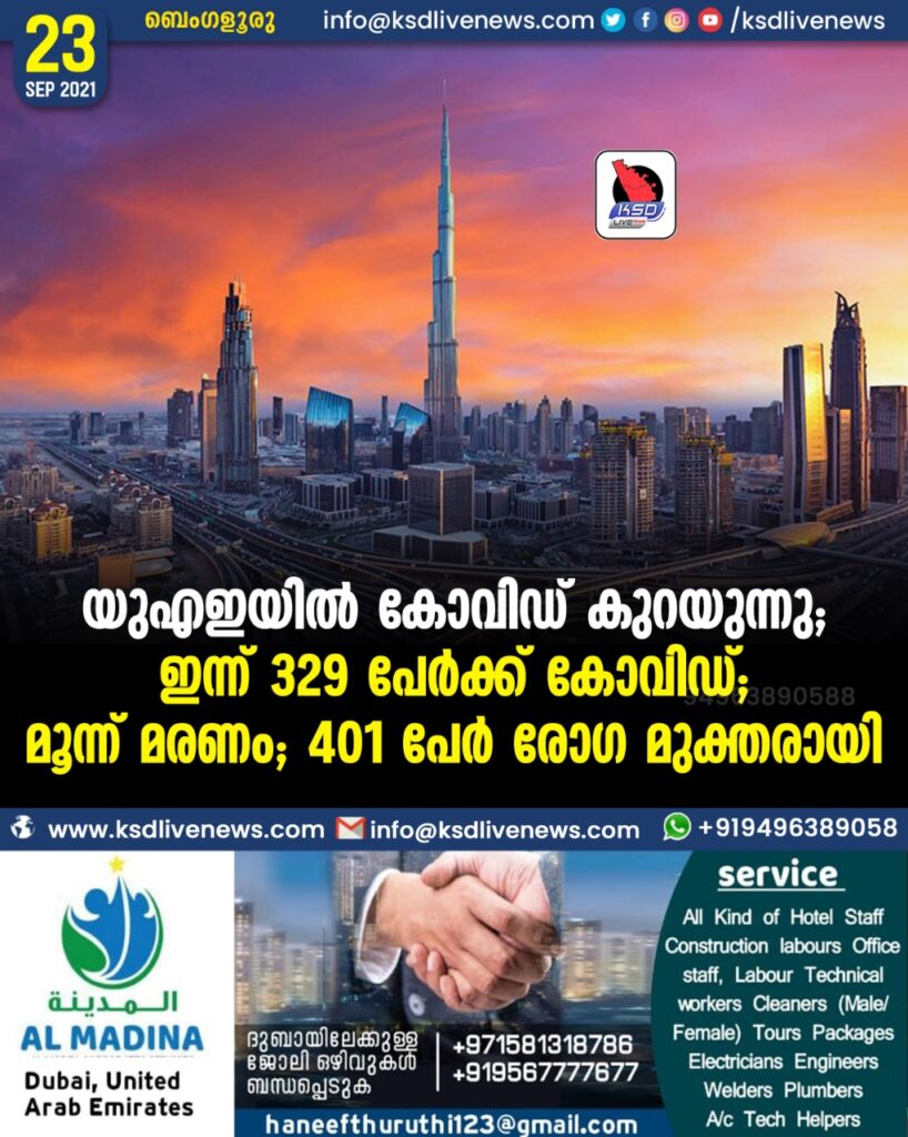 യുഎഇയില്‍ കോവിഡ് കുറയുന്നു; ഇന്ന് 329 പേര്‍ക്ക് കോവിഡ് ; മൂന്ന് മരണം; 401 പേർ രോഗ മുക്തരായി