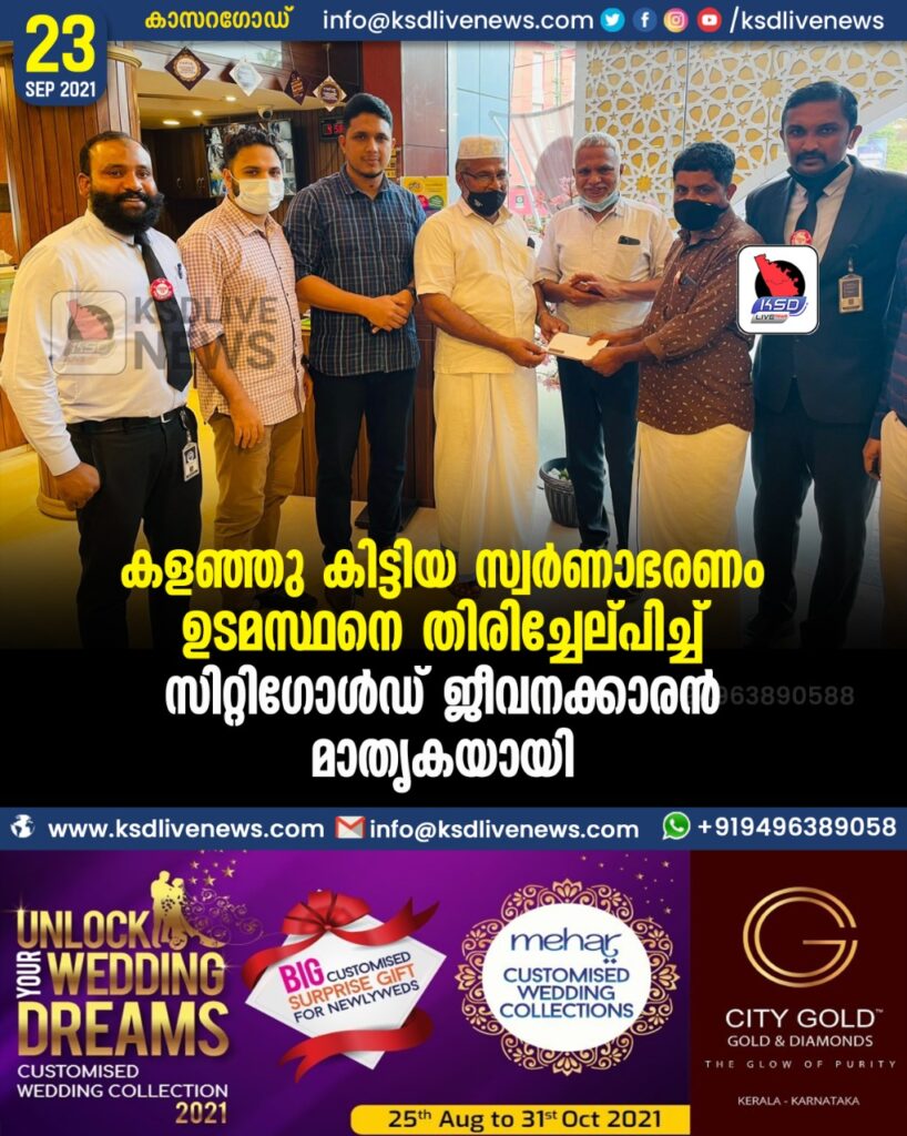 കളഞ്ഞു കിട്ടിയ സ്വർണാഭരണം ഉടമസ്ഥനെ തിരിച്ചേല്പിച്ച് സിറ്റിഗോൾഡ് ജീവനക്കാരൻ മാതൃകയായി