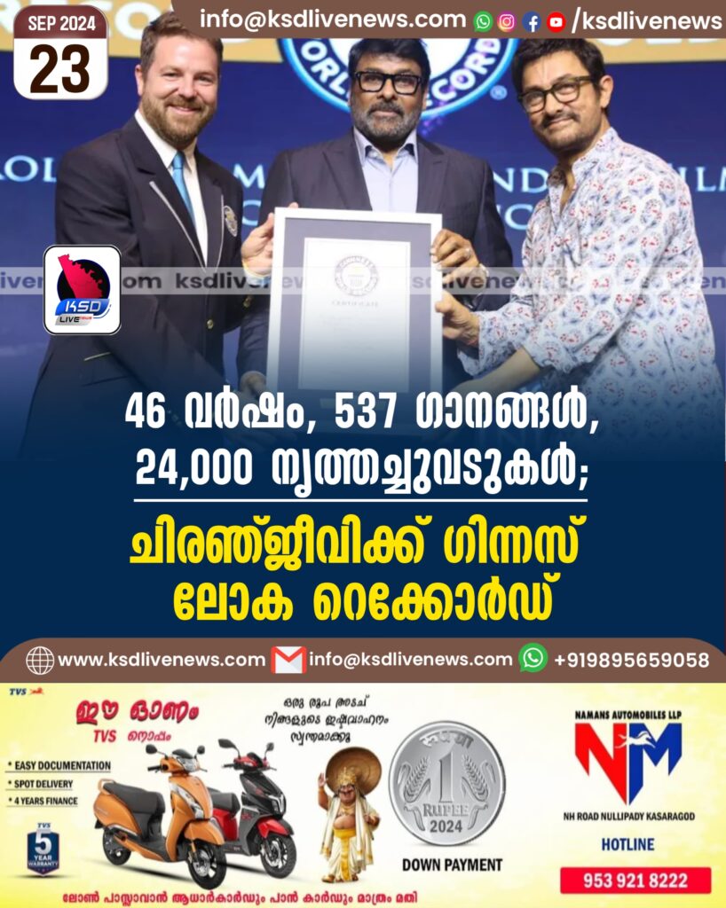 46 വർഷം, 537 ഗാനങ്ങൾ, 24,000 നൃത്തച്ചുവടുകൾ; ചിരഞ്ജീവിക്ക് ഗിന്നസ് ലോക റെക്കോർഡ്