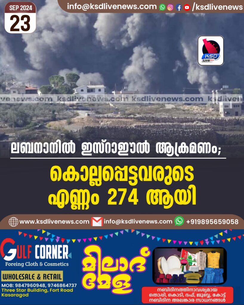 ഇസ്രയേൽ വ്യോമാക്രമണം: ലെബനനിൽ 274 പേർ കൊല്ലപ്പെട്ടു; മരിച്ചവരിൽ 21 കുട്ടികൾ, 1024 പേർക്ക് പരിക്ക്