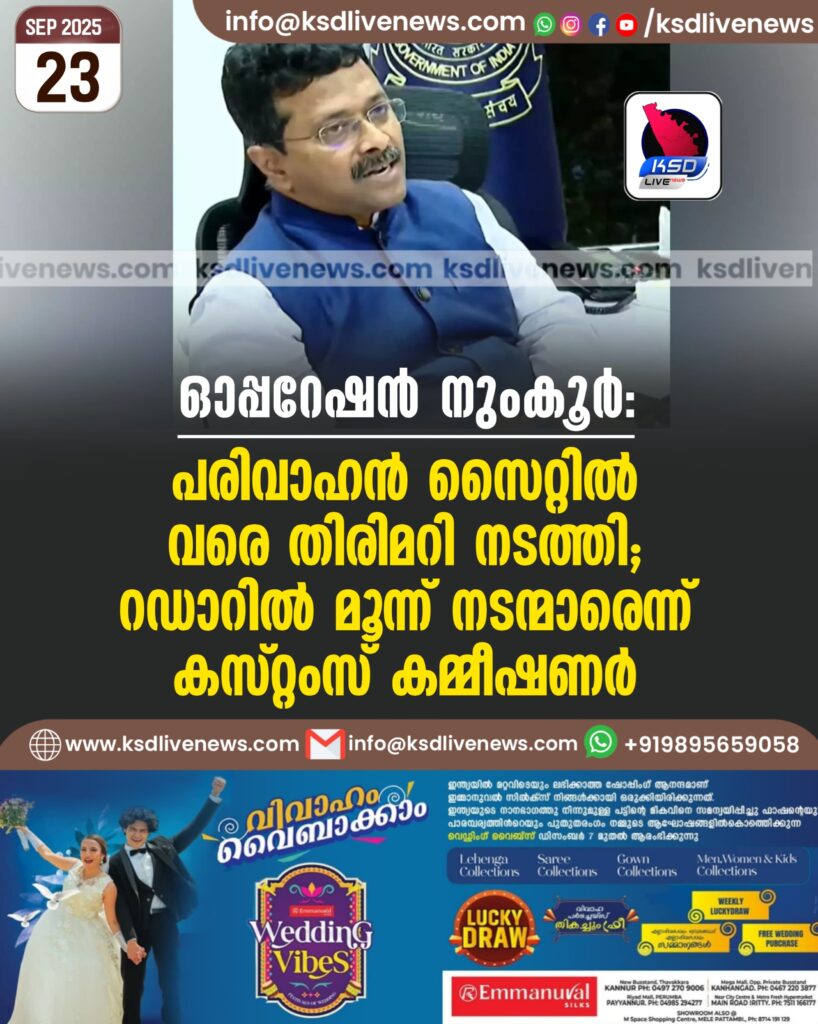 ഓപ്പറേഷൻ നുംകൂർ: പരിവാഹൻ സൈറ്റിൽ വരെ തിരിമറി നടത്തി; റഡാറിൽ മൂന്ന് നടന്മാരെന്ന് കസ്റ്റംസ് കമ്മീഷണർ
