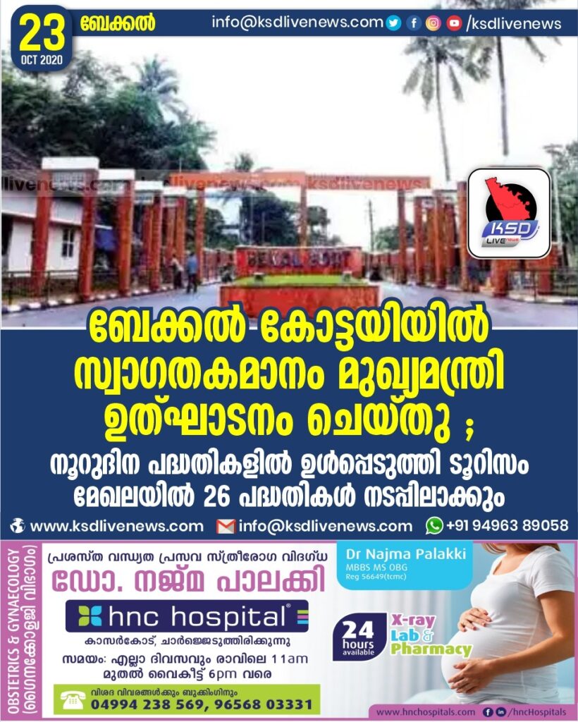 ബേക്കൽ: നൂറുദിന പദ്ധതികളിൽ ഉൾപ്പെടുത്തി ടൂറിസം മേഖലയിൽ 26 പദ്ധതികൾ ഉദ്ഘാടനം ചെയ്യുമെന്ന് മുഖ്യമന്ത്രി പിണറായി വിജയൻ പറഞ്ഞു. ബേക്കൽ കോട്ടയിൽ ടൂറിസം വകുപ്പ് ഒരുക്കിയ സ്വാഗതകമാനത്തിന്റെയും അനുബന്ധ സൗകര്യങ്ങളുടെയും ഉദ്ഘാടനം വീഡിയോ കോൺഫറൻസിലൂടെ നിർവഹിക്കുകയായിരുന്നു അദ്ദേഹം. ടൂറിസം രംഗത്ത് വലിയ നേട്ടങ്ങൾ കൈവരിക്കുന്ന സാഹചര്യത്തിലാണ് കോവിഡ് വെല്ലുവിളി വന്നത്. 25,000 കോടി രൂപയുടെ നഷ്ടമാണ് ഈ മേഖലയിൽ സംസ്ഥാനത്ത് ഉണ്ടായത്. വലിയ തോതിലുള്ള തൊഴിൽനഷ്ടവും ഉണ്ടായി. കോവിഡിനെ തുടർന്ന് പ്രതിസന്ധിയിലായ ടൂറിസംരംഗം വീണ്ടും കുതിച്ചുയരുമെന്നും കേരളം വീണ്ടും സഞ്ചാരികളുടെ പറുദീസയാകുമെന്നും അദ്ദേഹം പറഞ്ഞു. മന്ത്രി കടകംപള്ളി സുരേന്ദ്രൻ അധ്യക്ഷനായി. ഉദ്ഘാടനവേദിയോട് ചേർന്ന് സജ്ജീകരിച്ച പ്രവൃത്തിഫലകം മുഖ്യമന്ത്രിക്കുവേണ്ടി കെ. കുഞ്ഞിരാമൻ എം.എൽ.എ. അനാച്ഛാദനം ചെയ്തു. 2019 ജൂൺ മാസത്തിലാണ് 99,94,176 രൂപയുടെ പദ്ധതിക്ക് സംസ്ഥാന ടൂറിസം വകുപ്പ് അംഗീകാരം നൽകിയത്. സാങ്കേതികാനുമതി ലഭിച്ചയുടൻ നിർമാണപ്രവൃത്തി ആരംഭിച്ചത് കാരണം, സ്വാഗതകമാനം, ചുറ്റുമതിൽ, ഇന്റർലോക്ക് പതിച്ച നടപ്പാത, കൈവരികൾ, ട്രാഫിക് സർക്കിൾ എന്നിവ സമയബന്ധിതമായി പൂർത്തിയാക്കാൻ കഴിഞ്ഞു. ജില്ലാ നിർമിതി കേന്ദ്രത്തിനായിരുന്നു നിർമാണച്ചുമതല.