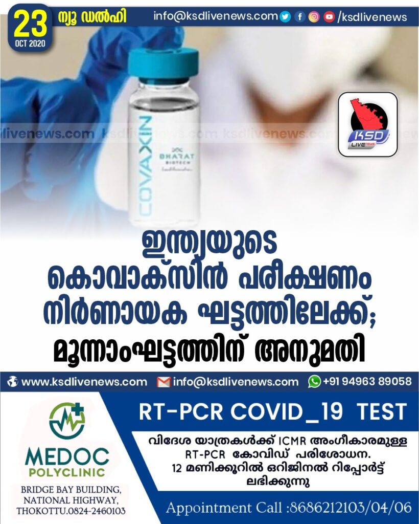 ഒക്ടോബര്‍ രണ്ടിനാണ് വാക്‌സിന്‍ നിര്‍മാതാക്കള്‍ മൂന്നാം ഘട്ട പരീക്ഷണത്തിന് അനുമതി തേടി ഡിജിസിഐയെ സമീപിച്ചത്. ഡല്‍ഹി, മുംബൈ, പട്‌ന, ലക്‌നൗ തുടങ്ങി രാജ്യത്തെ 19 കേന്ദ്രങ്ങളിലായാണ് ക്ലിനിക്കല്‍ പരീക്ഷണം നടക്കുന്നത്.