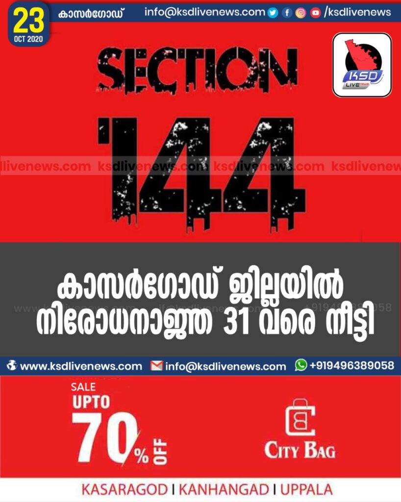 കാസര്ഗോഡ് ജില്ലയില് നിരോധനാജ്ഞ 31 വരെ നീട്ടി