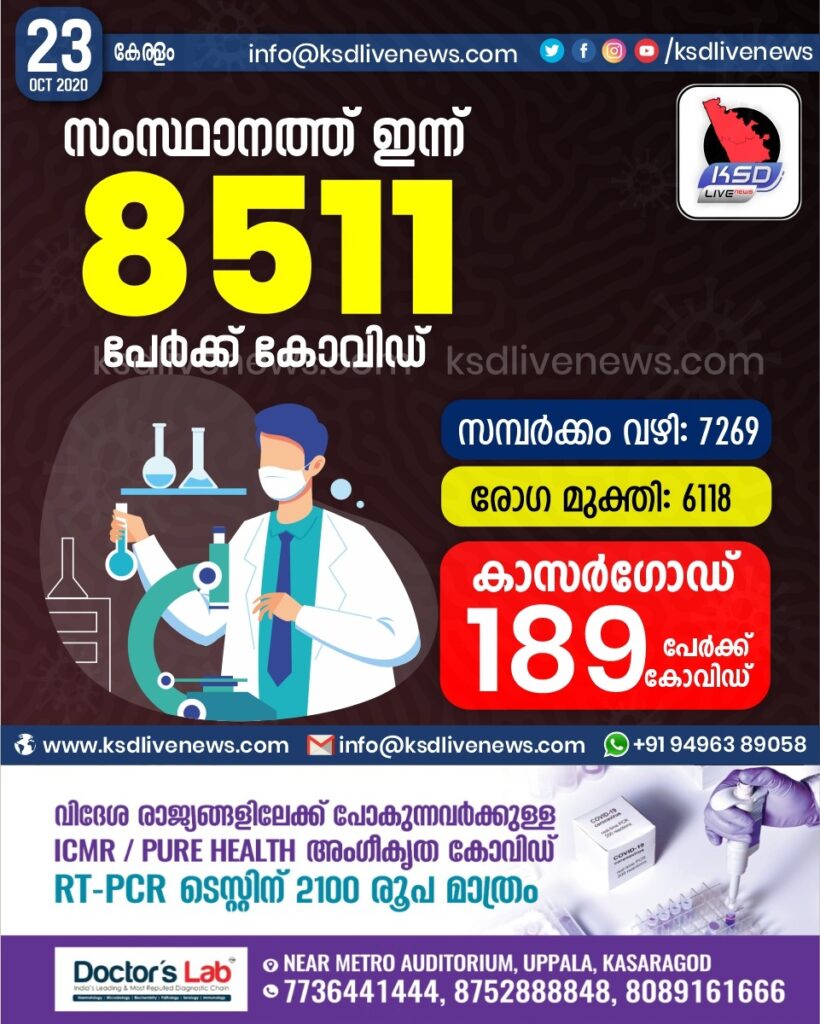 സംസ്ഥാനത്ത് ഇന്ന് 8511 പേർക്ക് കോവിഡ് സ്ഥിരീകരിച്ചു. സമ്പർക്കം വഴി 7269 പേർക്കും.രോഗ മുക്തി 6118 പേർക്കും. കാസർഗോഡ് ജില്ലയിൽ ഇന്ന് 189 പേർക്ക് കോവിഡ് സ്ഥിരീകരിച്ചു. മരണം 26