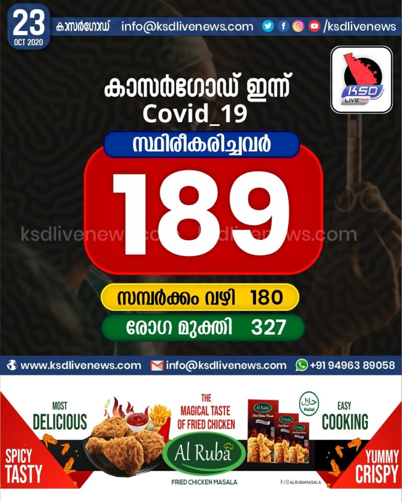 കാസർഗോഡ് ജില്ലയിൽ ഇന്ന് 189 പേർക്ക് കോവിഡ് സ്ഥിരീകരിച്ചു. സമ്പർക്കം വഴി 180 പേർക്കും. 327 പേർക്ക് രോഗ മുക്തി